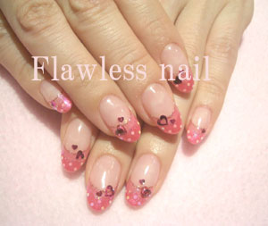 ピンクパールを一度塗り、2度塗りと濃度を変えてデザインしたWフレンチ。境い目にはピンクラメラインとオーロラホログラムを並べました!先端にはドットを付け色々な形のハートホログラムをプラスしたラブ運UPのラブリーネイルです!
